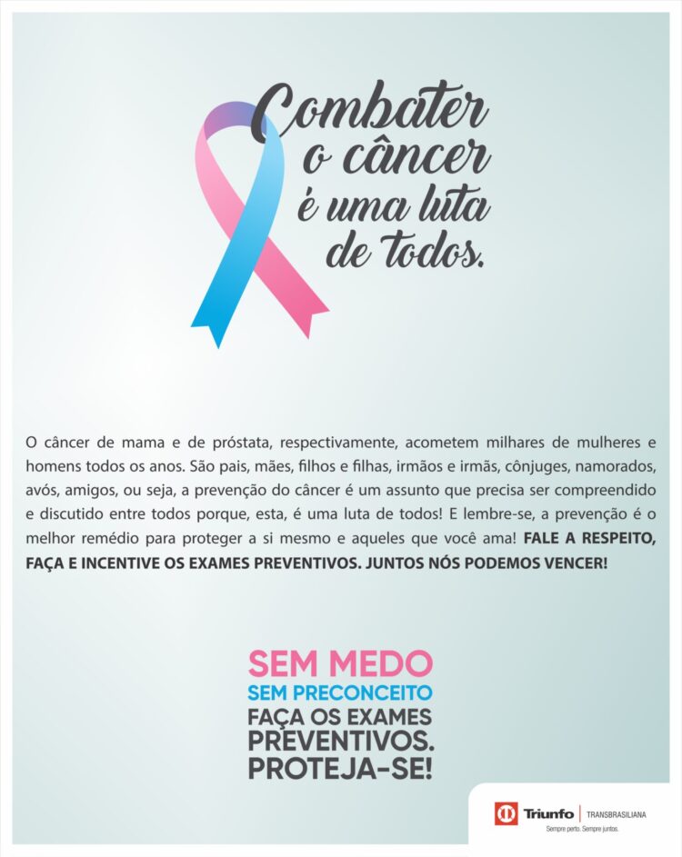 Para conscientizar mulheres e homens sobre a importância de realizar exames para diagnosticar precocemente o câncer de mama e de próstata, respectivamente, a Triunfo Transbrasiliana iniciou nesta segunda-feira, dia 1º, a campanha “Sem Medo, Sem Preconceito”.
