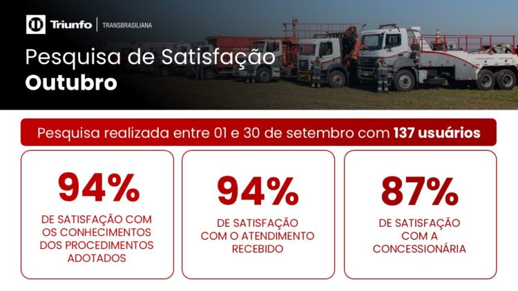 Em outubro, a pesquisa de satisfação contou com a participação de 124 usuários que avaliaram em 94% de satisfação com o atendimento recebido, 94% de satisfação com o conhecimento dos procedimentos adotados pelas equipes da Triunfo Transbrasiliana e 87% de satisfação geral com a Concessionária.