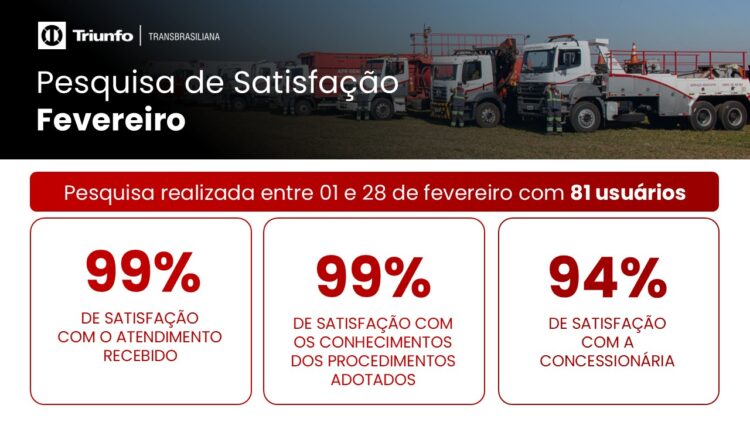 A Triunfo Transbrasiliana realiza mensalmente pesquisas de satisfação com usuários de seus serviços. Em fevereiro, 81 participantes avaliaram positivamente o atendimento, com índices de 99% de satisfação e 94% de aprovação geral, reforçando o compromisso da empresa com a excelência e a ISO 9001.