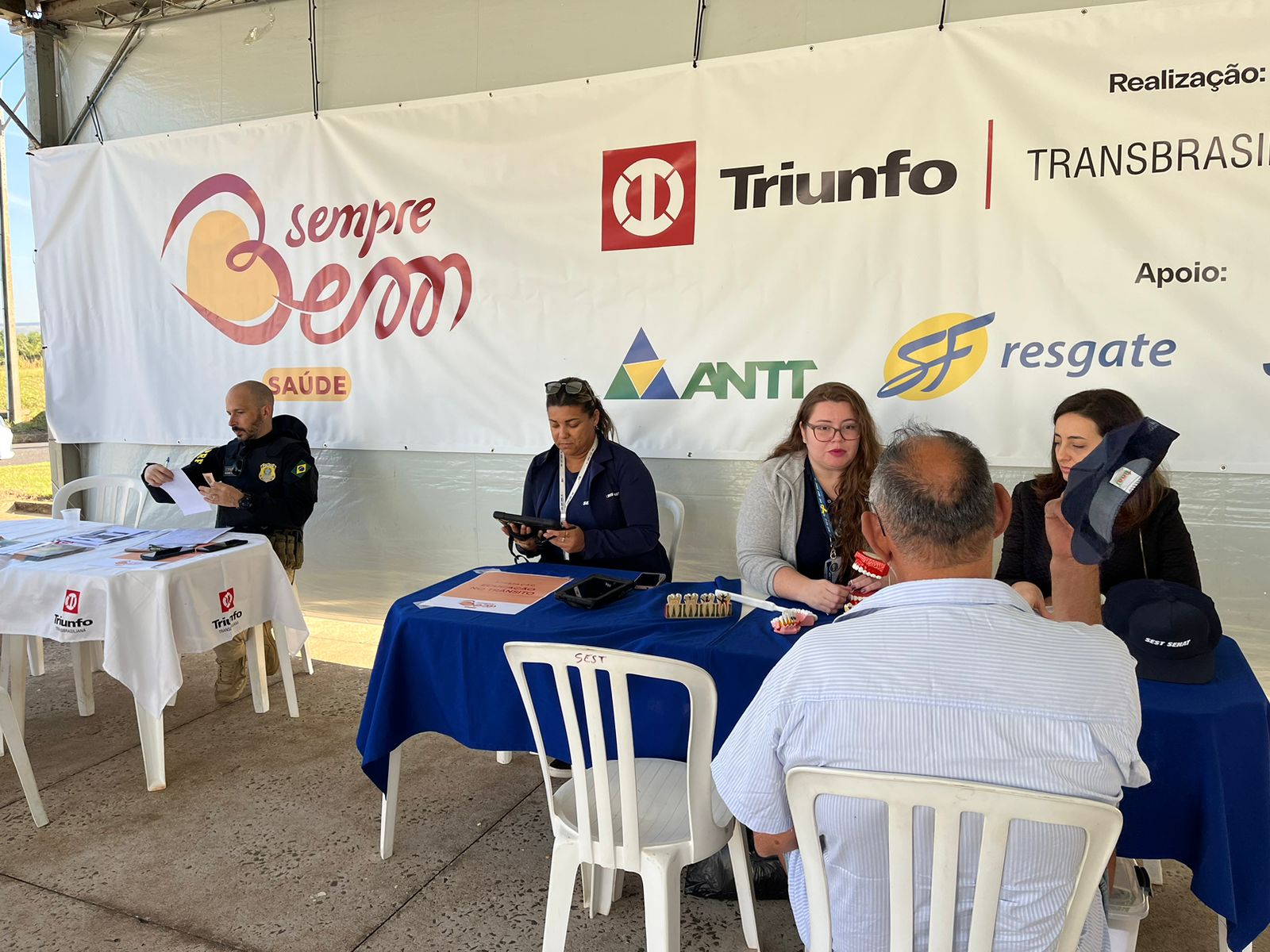 Em alusão aos 96 anos da Polícia Rodoviária – PRF e do Dia do Motorista, a Triunfo Transbrasiliana e a PRF de Marília realizaram a ação “Sempre Bem Saúde”, que ofereceu serviços gratuitos para 60 motoristas profissionais, na praça de pedágio de Vera Cruz (km 268+100). Os usuários tiveram à disposição: vacinação, aferição de pressão arterial, avaliação de peso e altura, teste de glicemia, dicas de saúde bucal, orientações sobre a importância de denunciar casos de abuso ou exploração sexual de crianças e adolescentes na rodovia, além de receber materiais promocionais.