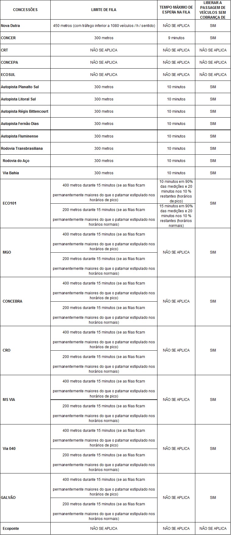 Confira o quadro resumo com o limite máximo do tamanho das filas e o tempo máximo de espera nas praças de pedágio para cada concessão: