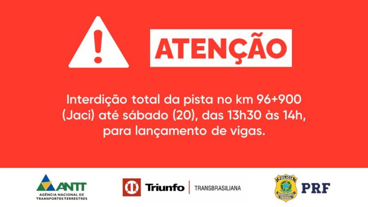 A Triunfo Transbrasiliana informa que nesta quinta-feira (1/6), no km 86+240 da BR-153/SP, em Mirassol, haverá alteração no tráfego.