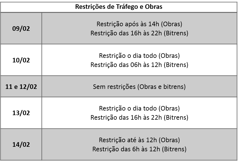 As equipes do serviço de atendimento emergencial estarão de prontidão para atender às emergências médicas e mecânicas. O trecho também irá contar com restrições de tráfego e de obras para não prejudicar a circulação de veículos durante o período de festas, de sexta-feira a quarta-feira. As restrições incluem trânsito de caminhões cegonhas e bitrens, operações Pare e Siga, além de desvios nos seguintes horários: