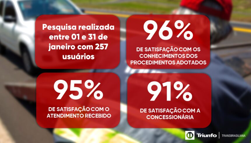 Em janeiro, a pesquisa de satisfação contou com a participação de 257 usuários que avaliaram em 95% de satisfação com o atendimento recebido, 96% de satisfação com o conhecimento dos procedimentos adotados pelas equipes da Triunfo Transbrasiliana e 91% de satisfação geral com a Concessionária.