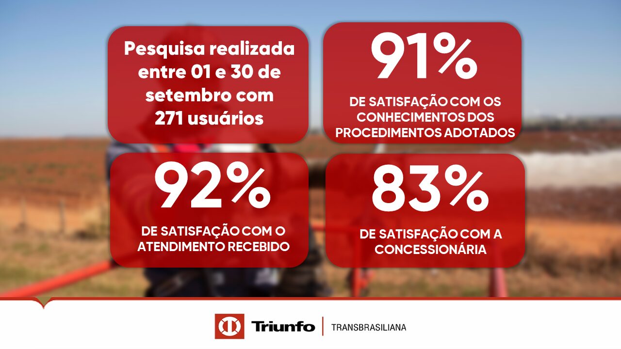 Em setembro, a pesquisa de satisfação contou com a participação de 271 usuários que avaliaram em 92% de satisfação com o atendimento recebido, 91% de satisfação com o conhecimento dos procedimentos adotados pelas equipes da Triunfo Transbrasiliana e 83% de satisfação geral com a Concessionária.