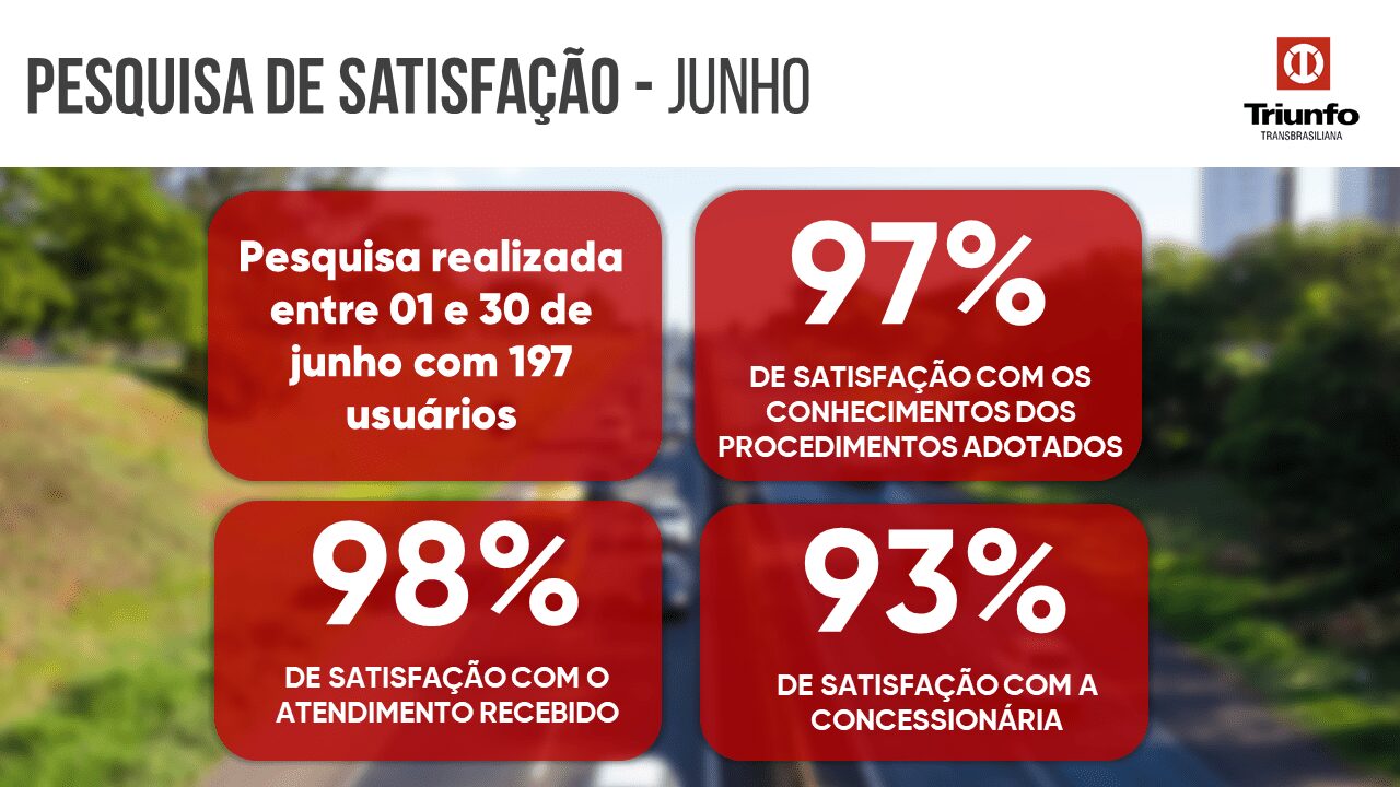 Em junho, a pesquisa de satisfação contou com a participação de 197 usuários que avaliaram em 98% de satisfação com o atendimento recebido, 97% de satisfação com o conhecimento dos procedimentos adotados pelas equipes da Triunfo Transbrasiliana e 93% de satisfação geral com a Concessionária.