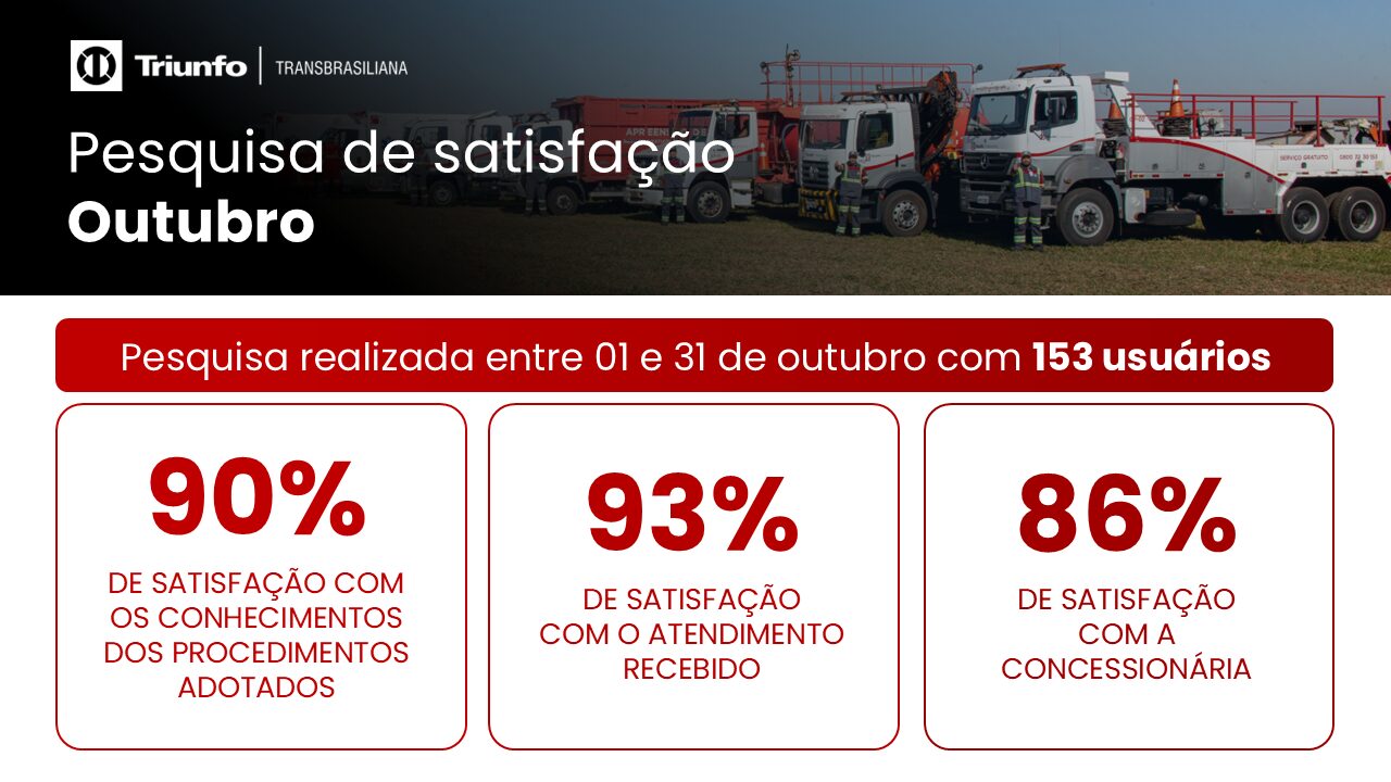Em outubro, a pesquisa de satisfação contou com a participação de 153 usuários que avaliaram em 93% de satisfação com o atendimento recebido, 90% de satisfação com o conhecimento dos procedimentos adotados pelas equipes da Triunfo Transbrasiliana e 86% de satisfação geral com a Concessionária.
