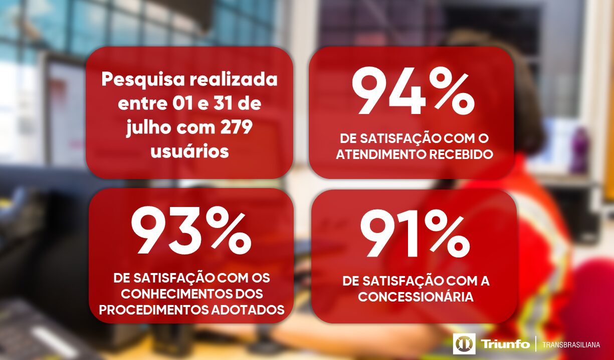 Em julho, a pesquisa de satisfação contou com a participação de 279 usuários que avaliaram em 94% de satisfação com o atendimento recebido, 93% de satisfação com o conhecimento dos procedimentos adotados pelas equipes da Triunfo Transbrasiliana e 91% de satisfação geral com a Concessionária.