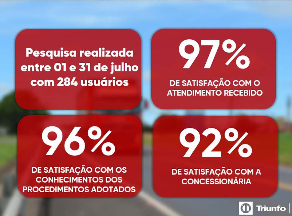 Em julho, a pesquisa de satisfação contou com a participação de 284 usuários que avaliaram em 97% de satisfação com o atendimento recebido, 96% de satisfação com o conhecimento dos procedimentos adotados pelas equipes da Triunfo Transbrasiliana, 85% de satisfação com tempo de conclusão do atendimento e 92% de satisfação geral com a Concessionária.