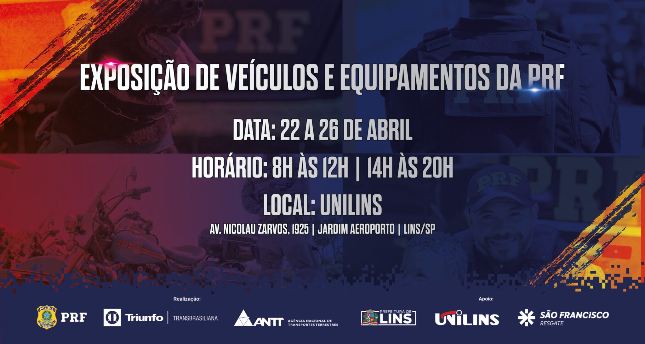 Em comemoração aos 104 anos de aniversário de Lins, a Polícia Rodoviária Federal – PRF e a Triunfo Transbrasiliana realizam entre segunda-feira (22/04) e sexta-feira (26/04), na Unilins, uma exposição de viaturas e equipamentos, além de serviços gratuitos ofertados pela Secretaria Municipal de Saúde de Lins.