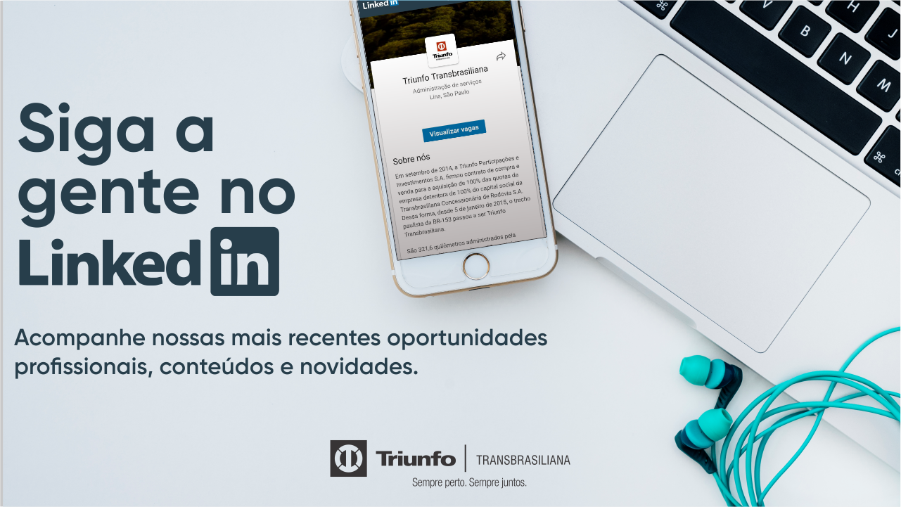 Para os interessados em acompanhar as oportunidades profissionais, novidades, conteúdos e boas práticas corporativas, a Triunfo Transbrasiliana acaba de lançar seu perfil na rede social LinkedIn (www.linkedin.com/company/triunfotransbrasiliana). A plataforma será mais um canal de comunicação da Concessionária direcionado para discussão de questões sobre carreira e trabalho, troca de informações e conhecimento.