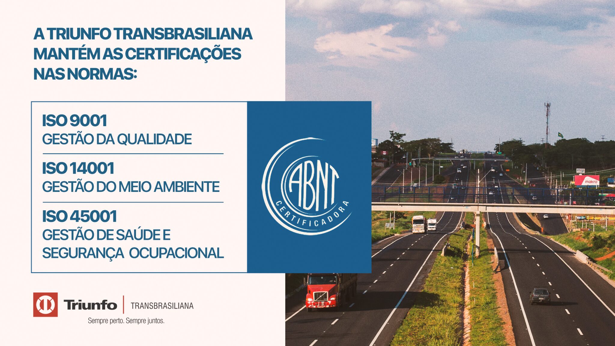 No início deste mês, a Triunfo Transbrasiliana recebeu a recertificação das normas ISO 9001 – Gestão de Qualidade, ISO 14001 – Gestão Ambiental e ISO 45001 – Gestão de Saúde e Segurança Ocupacional pela Associação Brasileira de Normas Técnicas – ABNT. Com isso, a empresa reafirma seu compromisso com a responsabilidade socioambiental, na garantia da prestação de serviços de excelência aos usuários da BR-153/SP e na saúde e bem-estar dos seus profissionais.