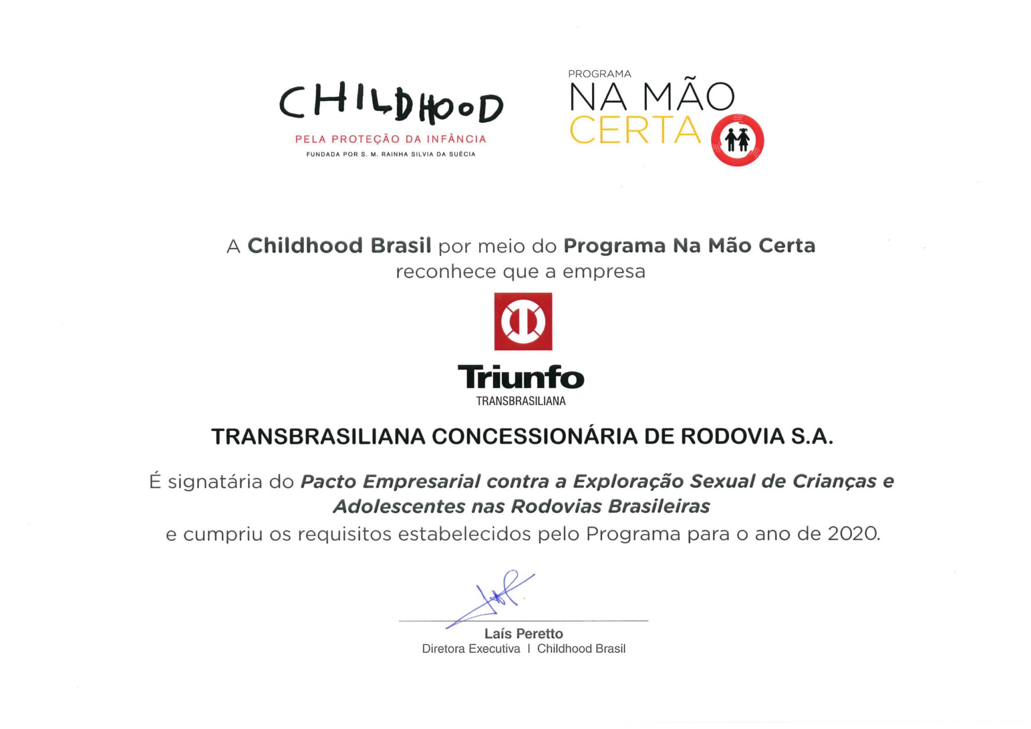 O reconhecimento é concedido pela Childhood Brasil, por meio do Programa Na Mão Certa, às empresas signatárias do Pacto Empresarial contra a exploração sexual de crianças e adolescentes nas rodovias brasileiras e que, cumpriram com o compromisso assumido, disseminando à causa. Desde 2015, a Triunfo Transbrasiliana faz parte do Programa Na Mão Certa e recebe há seis anos consecutivos o Certificado de Reconhecimento por suas ações em defesa da infância e contra a exploração de crianças e adolescentes em rodovias brasileiras.